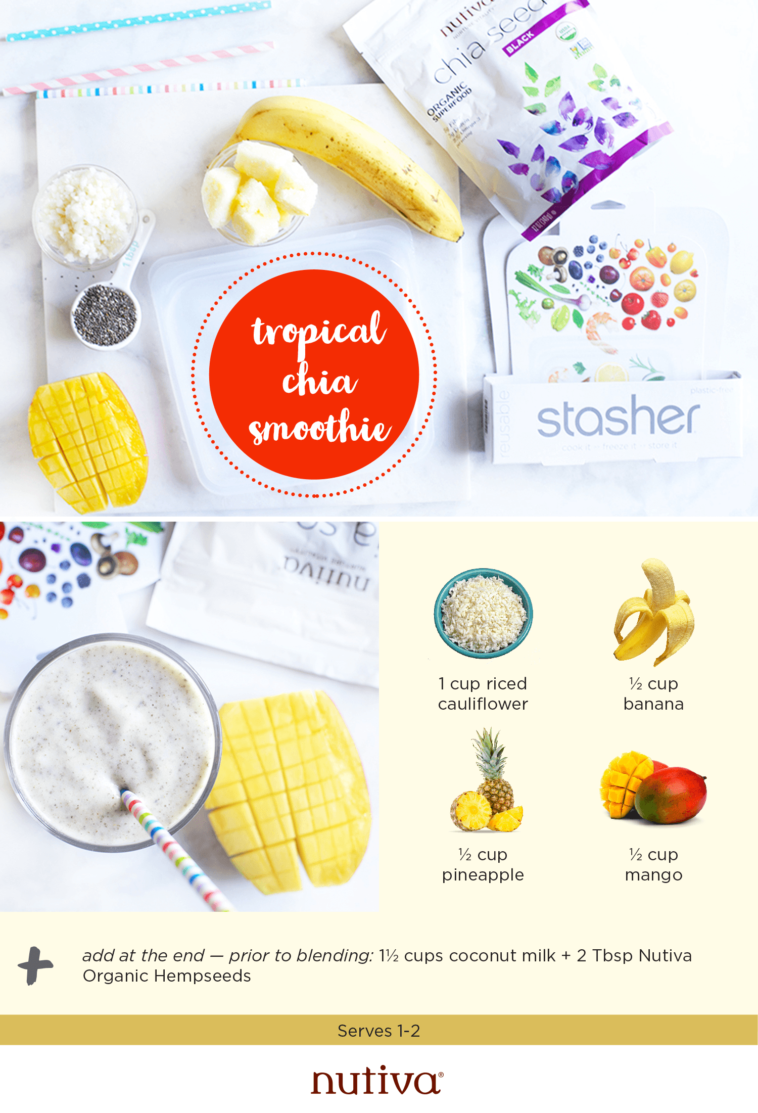 - Place cauliflower, banana, pineapple, and mango in a Stasher Bag.