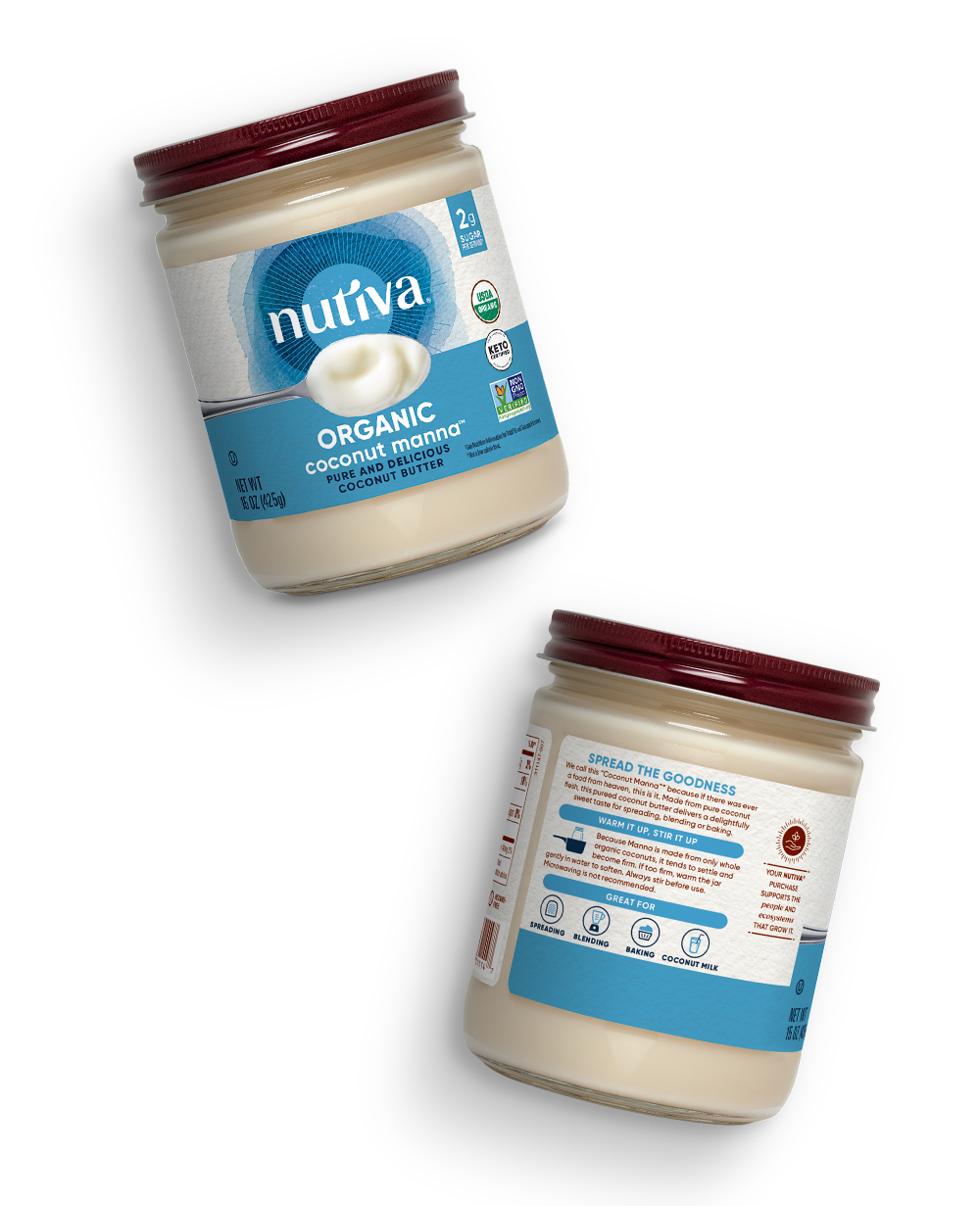 Nutiva Organic Coconut Manna is a coconut butter. It's pureed dried coconut meat, made from whole coconut with the water removed. It contains protein, carbohydrates, fiber, and oil.